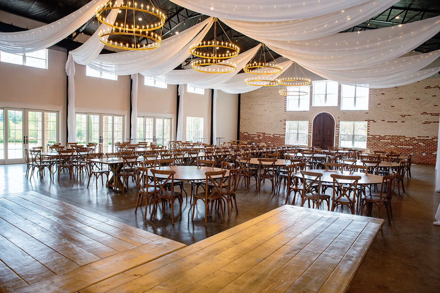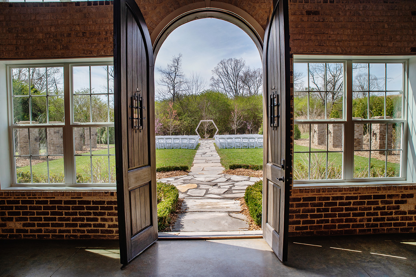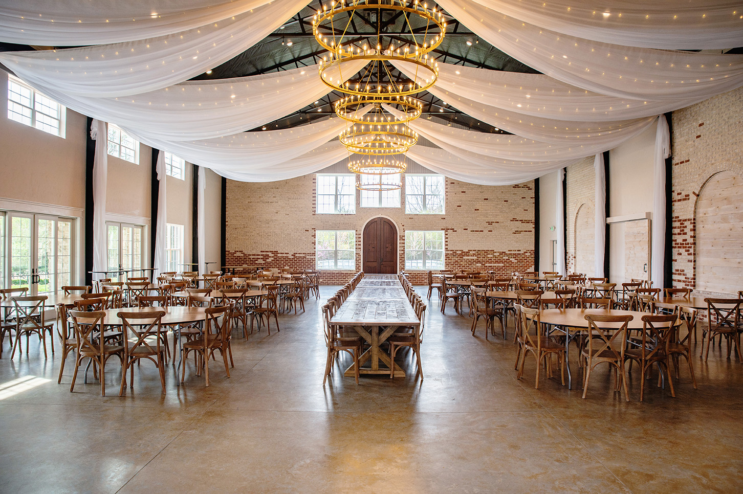 As guests enter through the iron-laden door, they are greeted by the curved grand staircase with playful Moroccan tile kickboards. Unexpected accents, such as the gorgeous two-tieredĀ golden clad candelabra style chandeliers cleverly blend industry and elegance. The interior features an exposed brick highlight, bistro-lit steel chandeliers and rafters, and a compilation of industrial-chic details. The flow of the venue will woo your guests as they move between the indoor reception hall and the easily accessible bistro-lit patio and ceremony site.